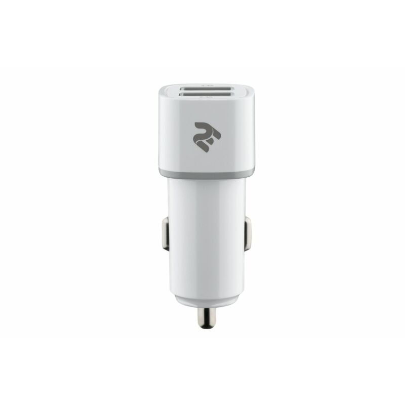 Універсальний автомобільний зарядний пристрій білого кольору з двома портами USB та силою струму 2.4А на кожний рознім. Підходить для одночасної зарядки смартфона та планшета.