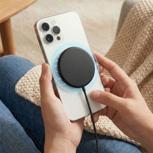 Зарядка щільно тримається на корпусі смартфона або MagSafe-чохлі. Телефоном можна користуватися під час заряджання — магніти не дають диску зміщуватися.