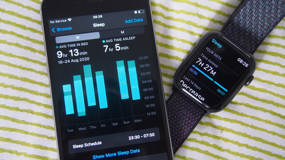 Годинник також враховує час, коли ви перебуваєте у стані неспання — наприклад, якщо прокидаєтесь серед ночі. Усі ці дані синхронізуються з додатком Health на iPhone, де можна побачити графік фаз, середню тривалість і тенденції за тиждень або місяць.