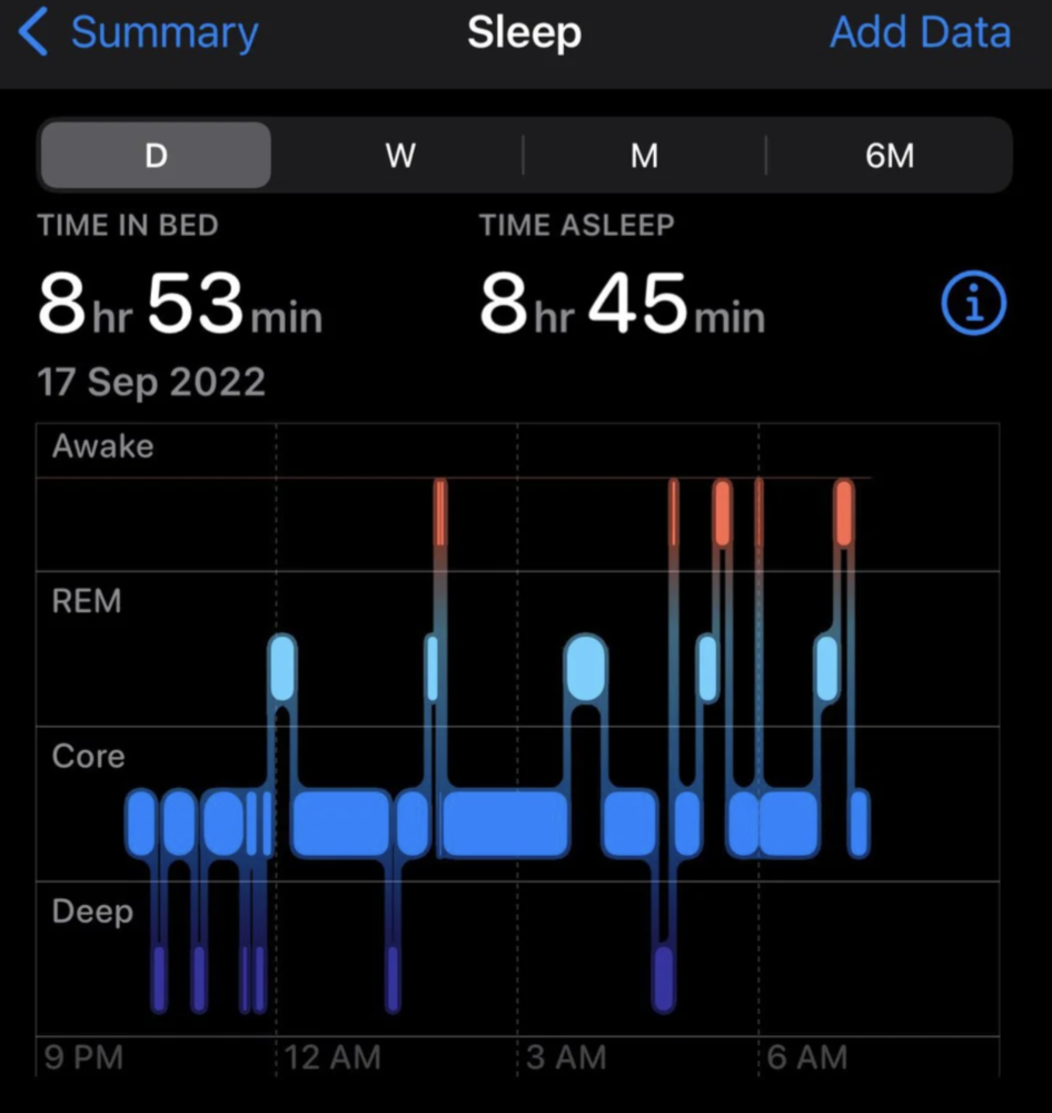 - На першій сторінці відобразиться графік фаз сну — REM, Core, Deep і Awake, кожна з яких позначена власним кольором.