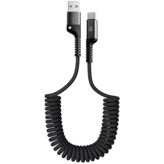 Завдяки спіральній формі кабель має компактний вигляд, але при розтягуванні може досягати до 1 метра. Це особливо зручно для використання в автомобілі, де важлива компактність предметів. Алюмінієві конектори не лише надають кабелю естетичний вигляд, але й забезпечують його довговічність, стійкість до корозії та зносостійкість.