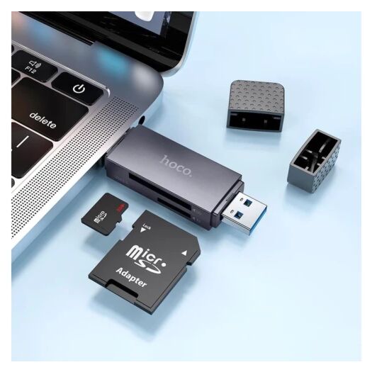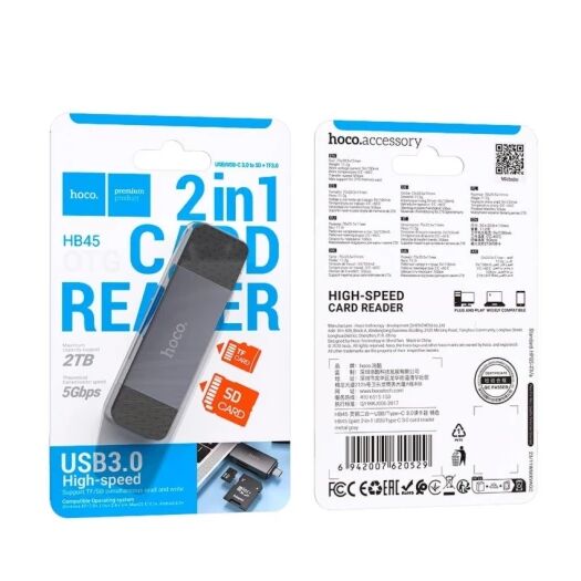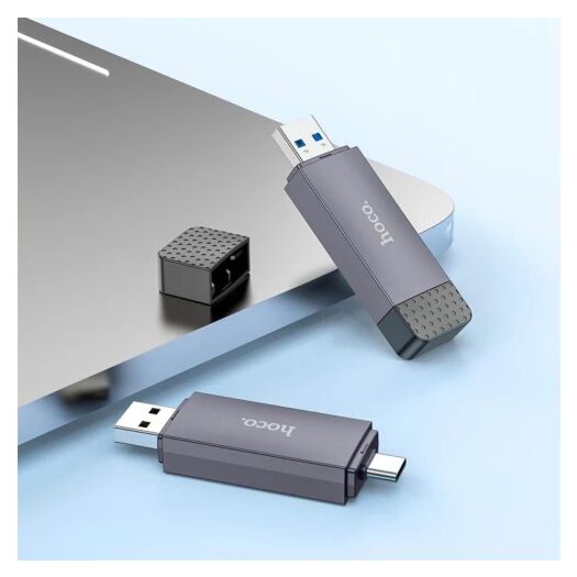 Картридер Hoco Spirit 2-in-1 HB45 забезпечує швидкий та ефективний обмін даними завдяки підтримці інтерфейсу USB 3.0 та Type-C. Пристрій гарантує швидкість передачі даних до 5 Гбіт/с, що дозволяє швидко переміщувати великі файли. Хаб працює з картками пам'яті форматів SD та TF (MicroSD) і підтримує максимальний обсяг пам'яті до 2 ТБ.