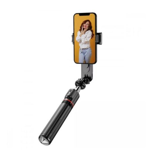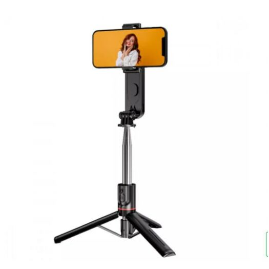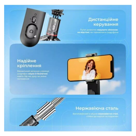 Механічний затискач надійно фіксує смартфон, а поворот на 360° дозволяє швидко змінювати орієнтацію кадру — вертикальну чи горизонтальну — без зняття пристрою. Знімний Bluetooth-пульт дає можливість керувати зйомкою дистанційно, що зручно для соло-контенту або групових фото.