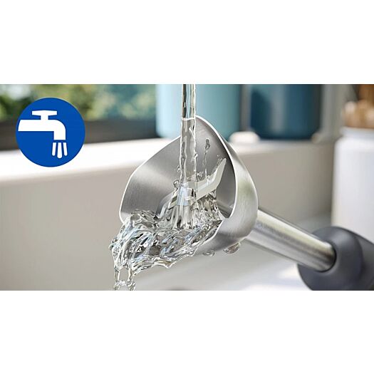 Модель має ергономічний дизайн для комфортного використання. Зручна кнопка дозволяє знімати ніжку блендера однією рукою, що робить процес максимально простим. У комплекті йде мірна склянка об’ємом 0.5 л, виготовлена з матеріалу без BPA, що робить її безпечною для приготування навіть дитячого харчування. Завдяки продуманій конструкції та високій ефективності цей блендер стане практичним вибором для тих, хто цінує швидкість, зручність і якість у приготуванні страв.