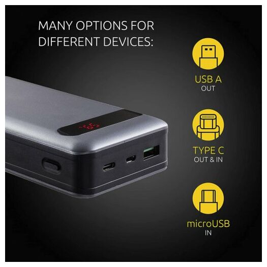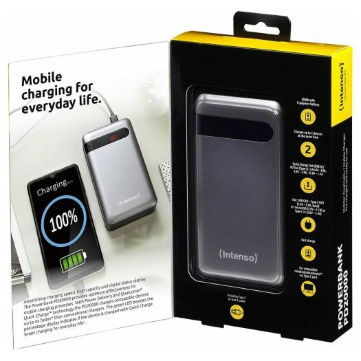 Intenso PD20000 оснащена потужними технологіями швидкої зарядки QC 3.0 та Power Delivery 20W, що дозволяють заряджати пристрої у найкоротші терміни, зберігаючи при цьому надійність та безпеку. Інтерфейси підключення включають як вхідні microUSB і USB Type-C, так і вихідні USB Type-C та USB-A, що забезпечують максимальну сумісність з різними типами кабелів та пристроїв.